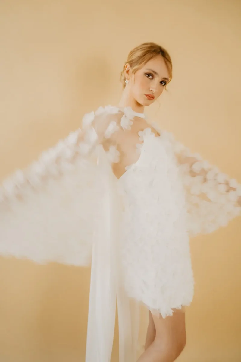 El vestido ideal para novias e invitadas Millennial. Es una combinación entre su mundo y el nuestro. La parte de atrás del vestido tiene triangulaciones en el corte, en los remates de la espalda y también en la zona delantera, inspiradas en los cortes Art Decó.