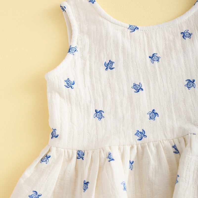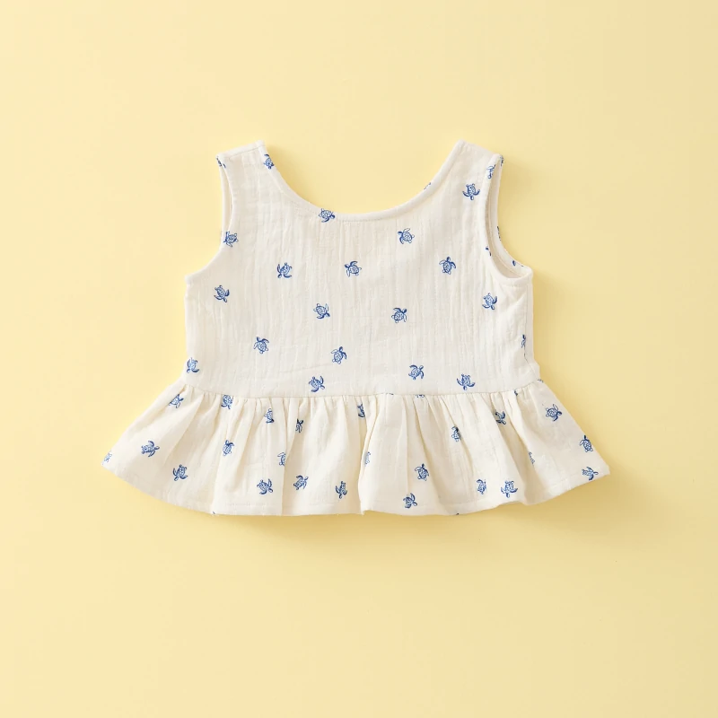 BLUSITA PEPLUM TORTUGAS MI CANESU, confeccionada en tejido de bambula blanco con estampación de tortugas marinas pequeñas en tono azul.