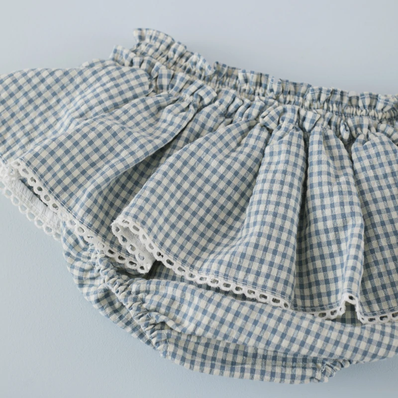 BRAGA MINIFALDA MINIVICHY AZUL DENIM MI CANESU, confeccionada en un bonito tejido de minivichy, cinturilla de goma y un volantón acabado en una pequeña puntilla. Pertenece a la colección INVIERNO 2025.