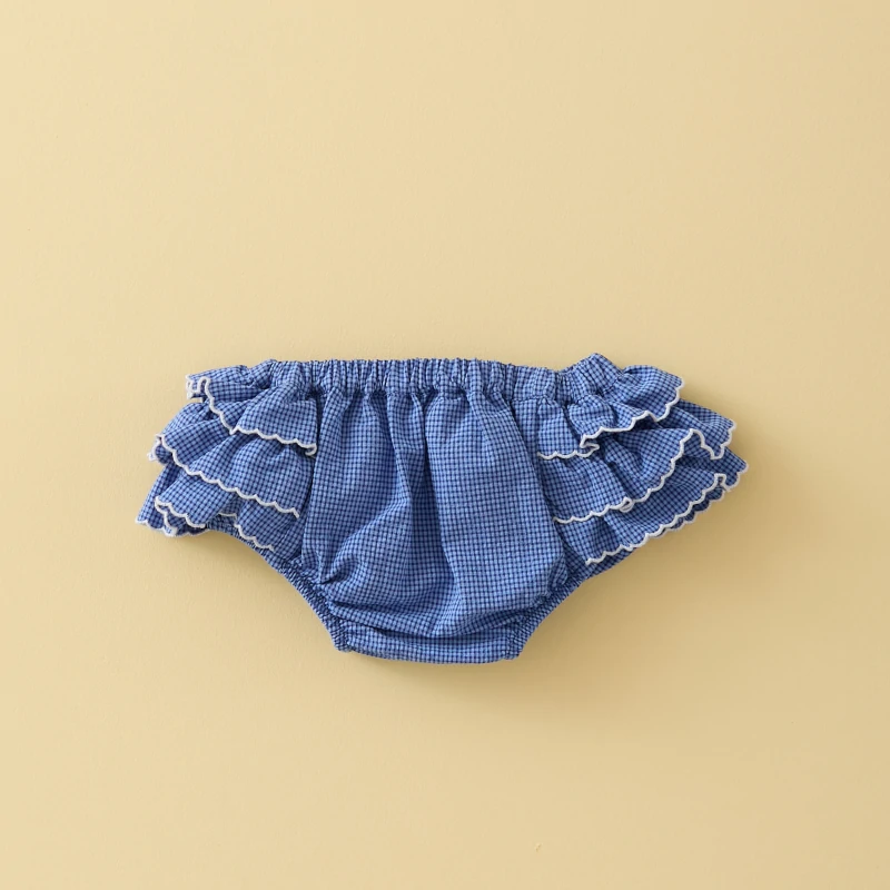 BRAGA VOLANTITOS MINIVICHY AÑIL MI CANESU, confeccionado en tejido en mini cuadros azul marino sobre fondo de tejido azul añil. Elástico en la cintura y cascada de volantes con ribete de ondas en color blanco. Los volantes salen desde los laterales hasta toda la parte de atrás. Pertenece a la colección BLUE SAND de la firma española de moda infantil MI CANESU VERANO 2026.