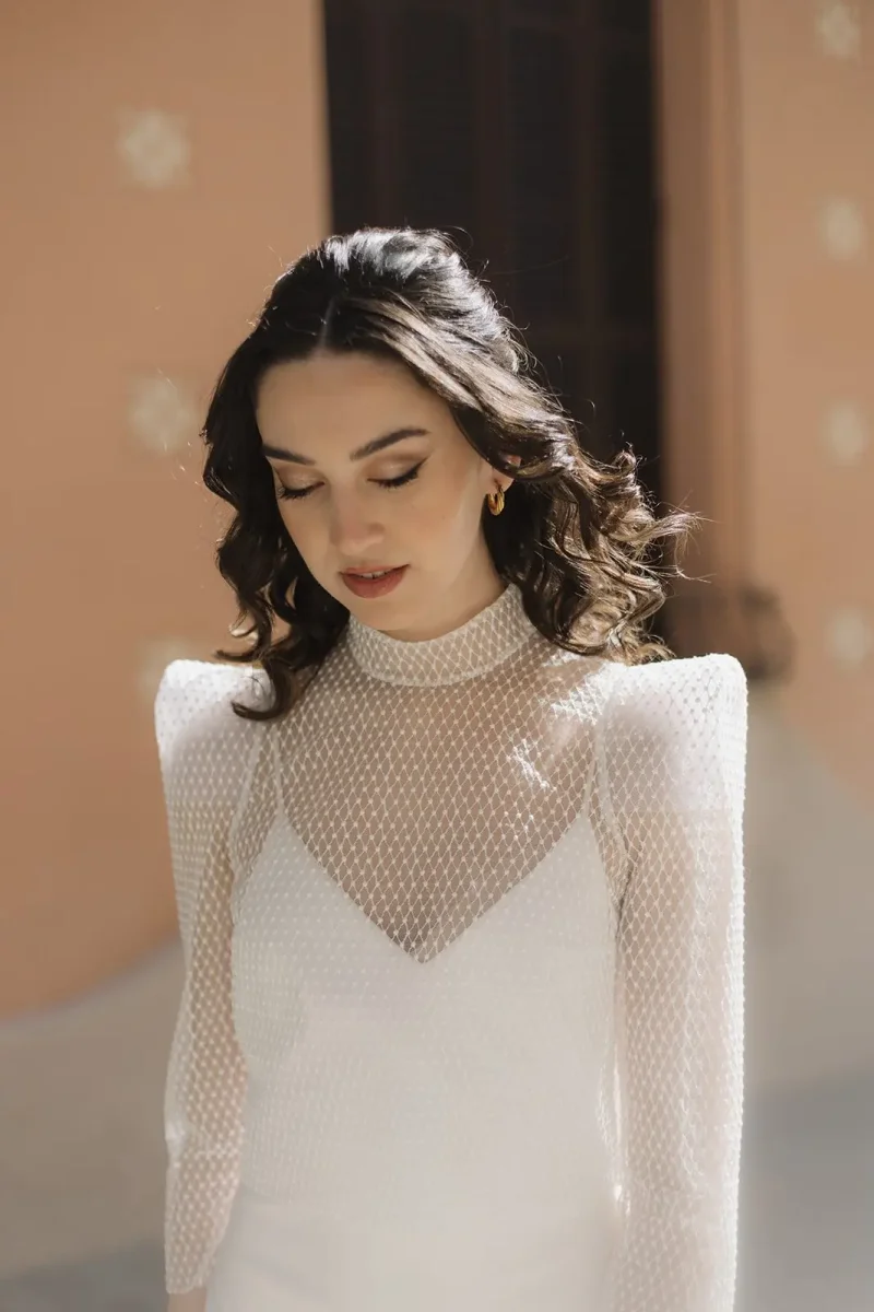 El vestido ideal para novias e invitadas Millennial. Es una combinación entre su mundo y el nuestro. La parte de atrás del vestido tiene triangulaciones en el corte, en los remates de la espalda y también en la zona delantera, inspiradas en los cortes Art Decó.