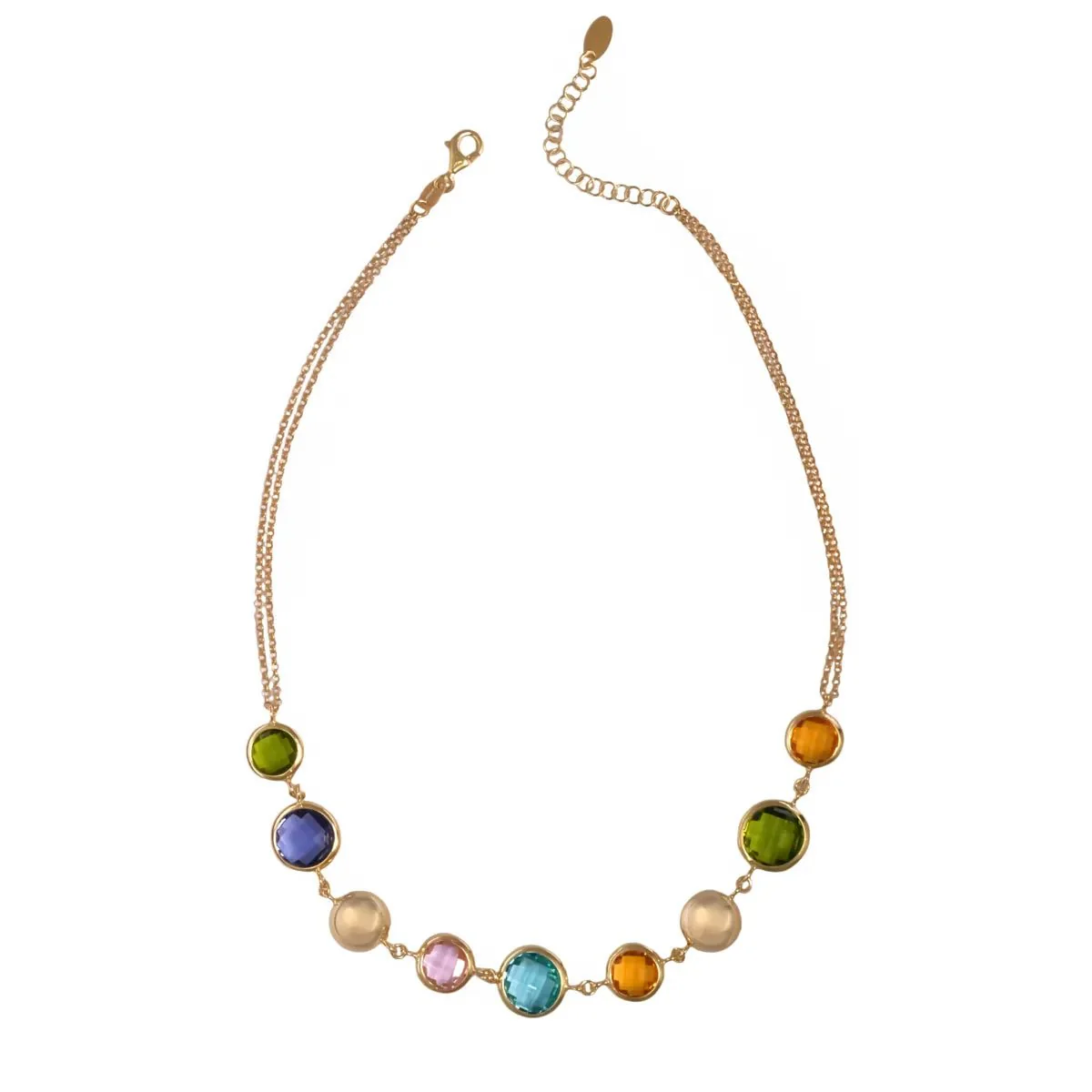 Collar en plata con baño de oro y 7 piedras semipreciosas talladas facetadas y bolas, cierre mosquetón