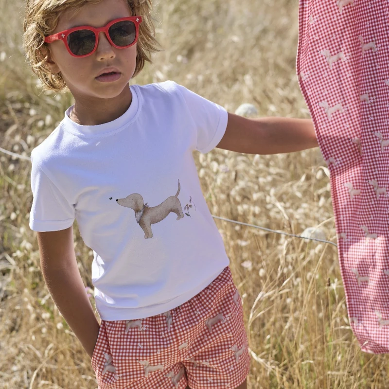 Incluye: Camiseta de algodón con motivo central y bóxer de baño a juego.