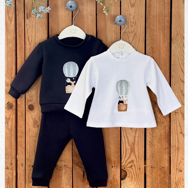 La sudadera confeccionada en tejido jogging de algodón invernal color marino, cuello a la caja en goma elástica en el mismo tono en la parte inferior de la sudadera y en los puños. En la parte central delantera un globo con una graciosa cestita de mimbre con dos animalitos. El pantalón largo de camal recto , color marino, cinturilla engomada y goma en la parte inferior del camal para que no se le suba. La camiseta , confeccionada en tejido de algodón blanco , cuello a la caja y el mismo dibujo figurativo que la camiseta en la parte central.
