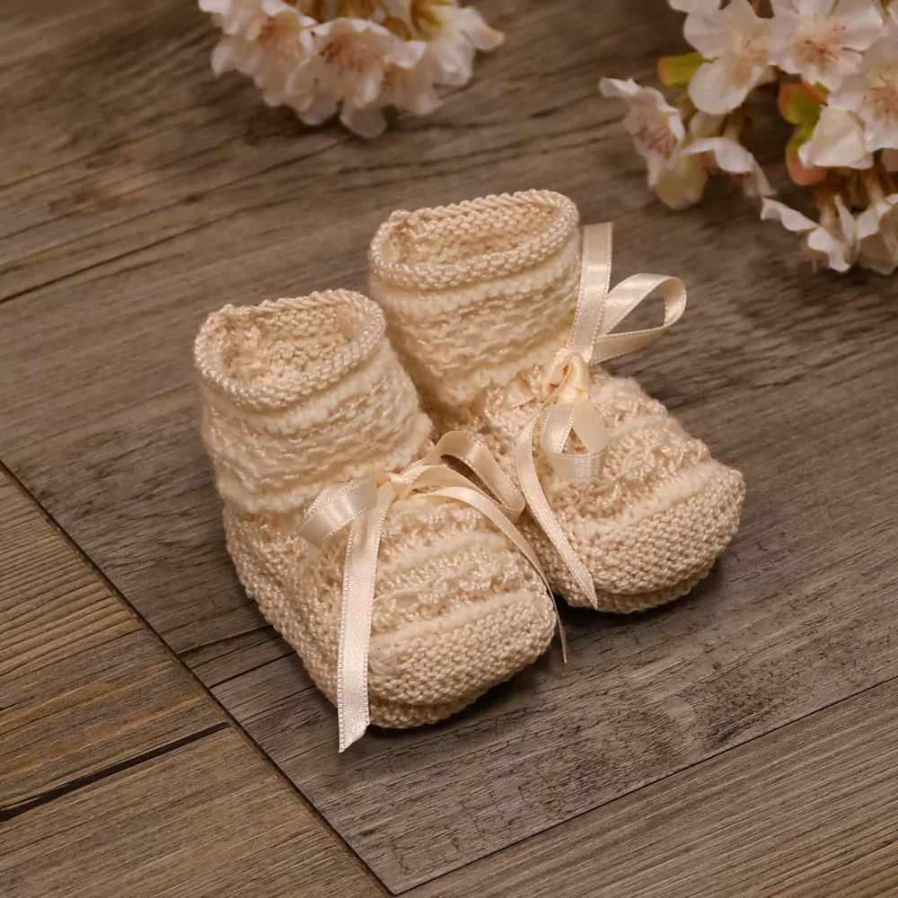 Conjunto compuesto de chaquetita, gorro y patucos. Realizada de forma artesanal, totalmente a mano en perle de algodón y lana. Lleva entredoses de Valenciennes en la perchera y un pequeño bordado. El jersey se remate con una fina puntilla de Valenciennes.