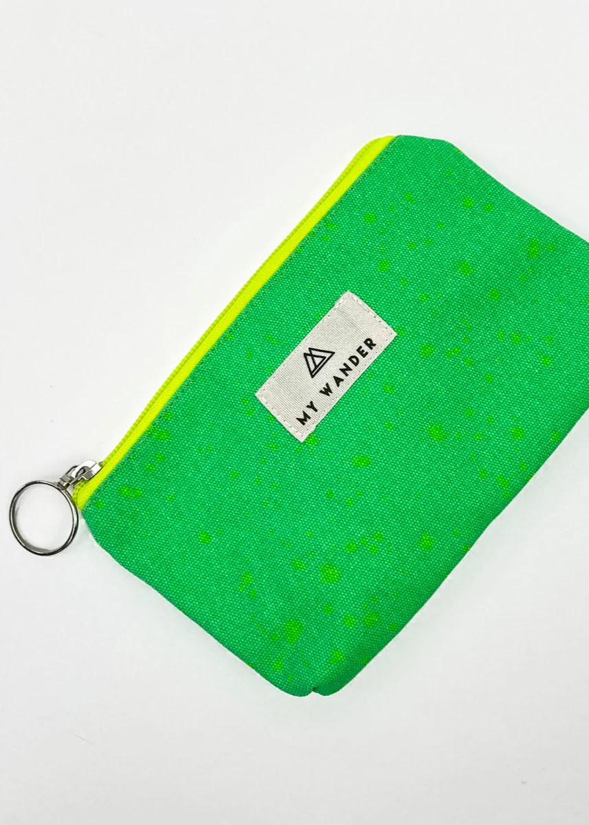 El estuche/monedero Drops Verde de My Wander está hecho con tela reciclada, y totalmente única.