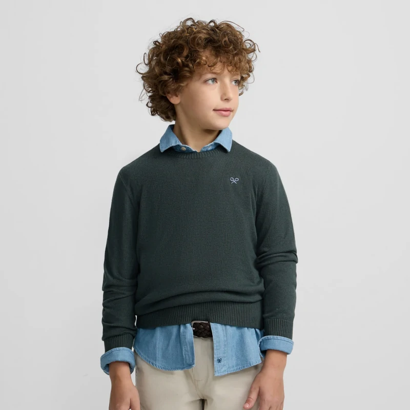 Jersey kids round neck en color verde confeccionado en mezcla de algodón BCI y cashmere. Presenta cuello redondo y manga larga. Cuenta con detalle de raquetas bordadas en el torso.