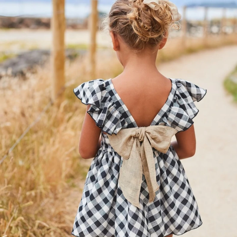 Jesusito BLACK & WHITE VICHY LA MARTINICA, confeccionado en vichy de cuadro grande blanco y negro, de talle a la cintura, así como falda de vuelo, que incluye braguita en el mismo tejido. Cuenta con escote rectangular delantero y en pico trasero, así como volantes grandes en los hombros hasta el talle ribeteados en rulo negro. Estos volantes continúan por detrás adornando los tirantes que se cruzan en la espalda finalizando en un bonito lazo en tejido tostado enrulado al tono. La falda se presenta cortada al bies, así como enrulada en el filo. De la COLECCIÓN BLACK & WHITE, de la casa de moda infantil LA MARTINICA, verano 2025.