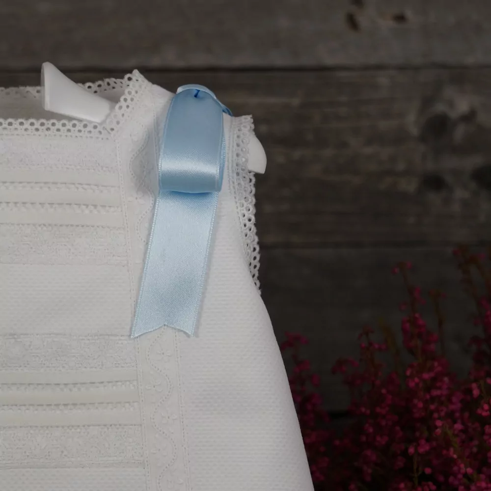 Jesusito en piqué con braguita y capota a juego. Está trabajado con grupos de patas de gallo y entredoses de valenciennes.