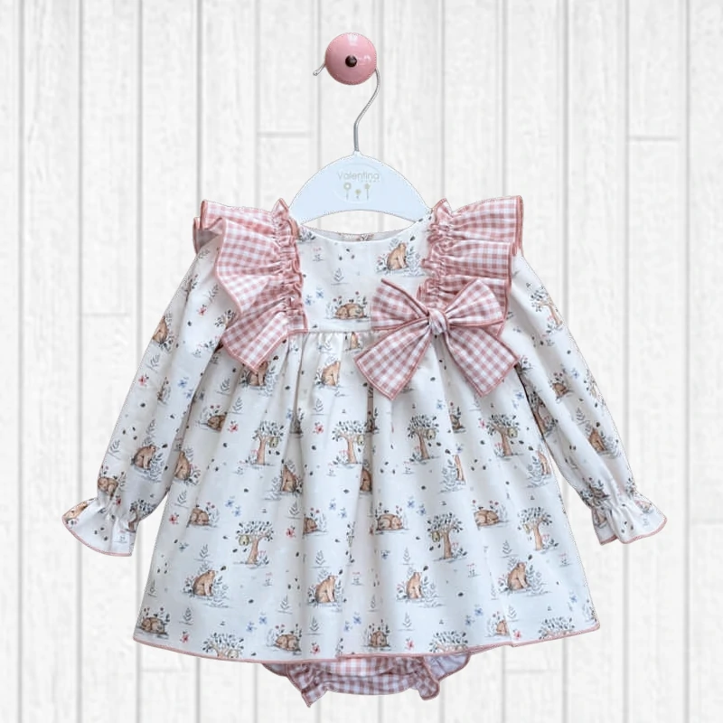JESUSITO OSITOS DONATELLA ROSA VALENTINA BEBES, confeccionado en tejido sobre fondo blanco insertando ositos figurativos por todo el tejido en tonos rosa. Corte de talle alto, sobre el cual salen dos volantes con repulgo en tono rosa con tejido vichy que suben por los hombros en vertical hacia la costura trasera. Una bonita lazada no excesivamente grande completa el detalle en el talle ( va cosida). La manga va engomada en el puño para que no se suba y lleva repulgo en rosa al finalizar la manga. La braguita o culotte está confeccionado en tejido vichy rosa haciendo juego con los volantes de la prenda superior.