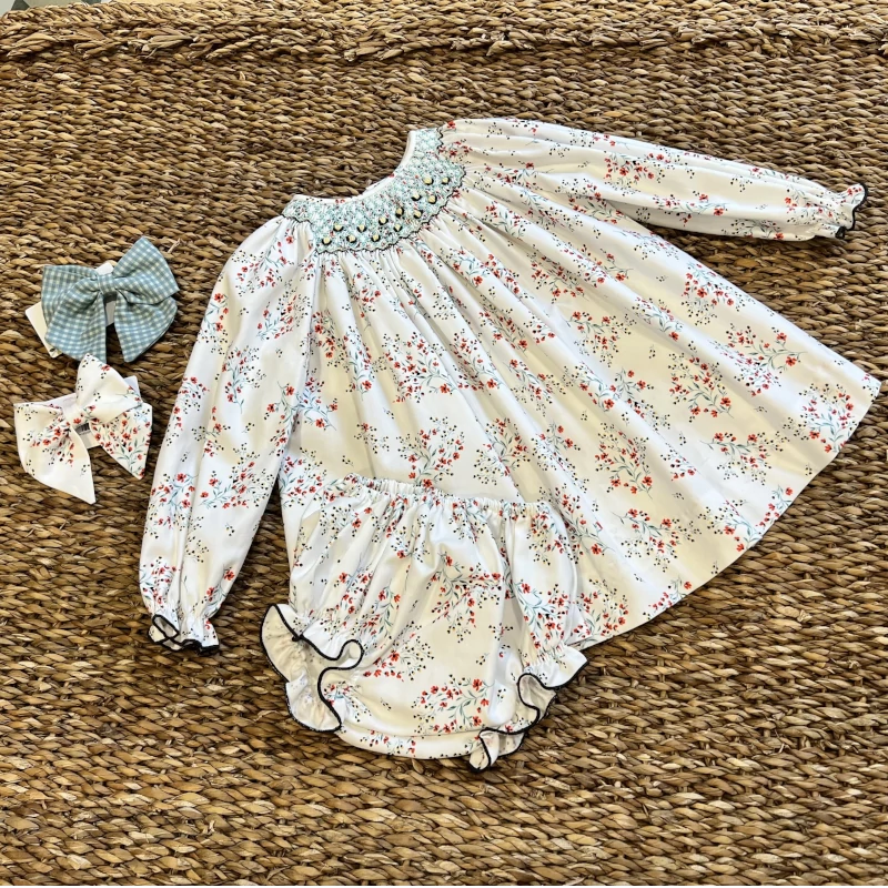 JESUSITO SMOCK RAMA MANUELA MONTERO, confeccionado en un precioso tejido sobre fondo blanco roto con sutiles ramas con florecitas en tonos rojos y amarillos. Corte alto con el engomado de punto de smock y abertura por detrás mediante botones de madera serigrafiados con el nombre de la firma. Lleva braguita a juego incluida.