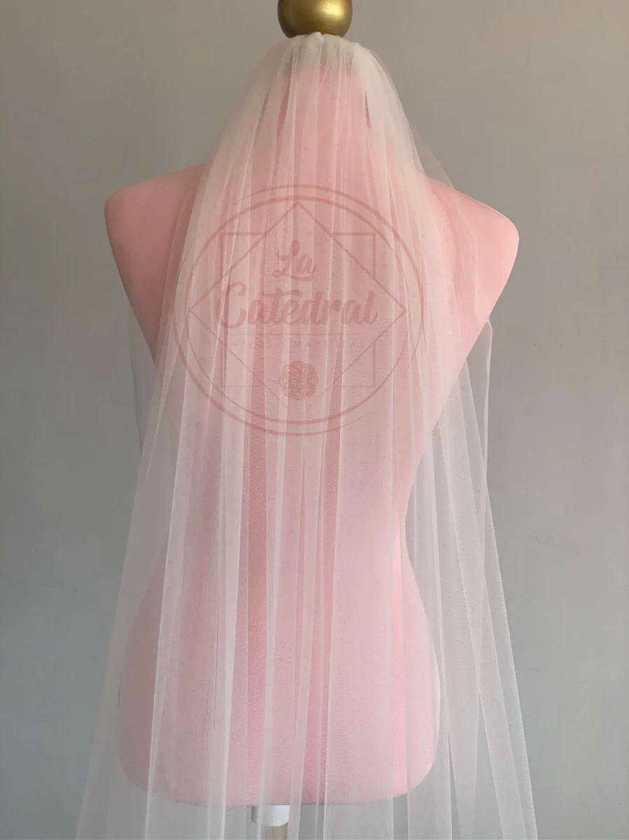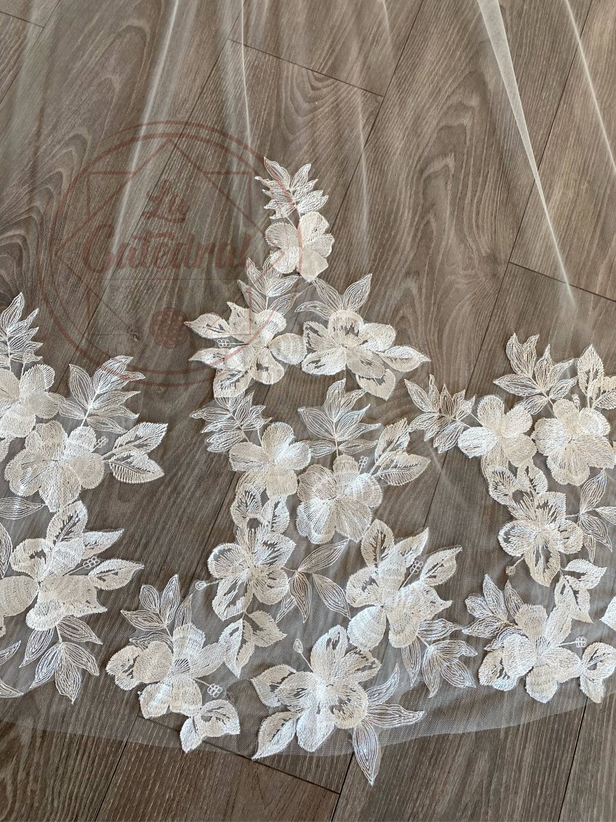 Tipo: Velo catedral una capa con peineta, montada en tulle de seda cristal con aplicaciones de flores grandes satinadas para un look muy fresco y elegante.