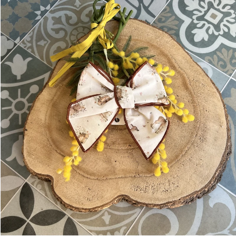 LAZO MEDIANO BAMBIS BICHITOS, confeccionado en tejido de fondo claro con bonitos bambis en diferentes posiciones ( sentados, de pie, recostados..) donde predominan los tonos marrones. Todo el lazo está ribeteado en rulo color mokka-caramelo. Es el complemento ideal para la colección BICHITOS, pudiendo encontrar en nuestra web el pelele unisex de bambis, el conjunto de dos piezas con su chaqueta de camisa en bambis y culote braga en tejido vichy, el vestido de vichy, el jesusito de bambis combinado con tejido de vichy.