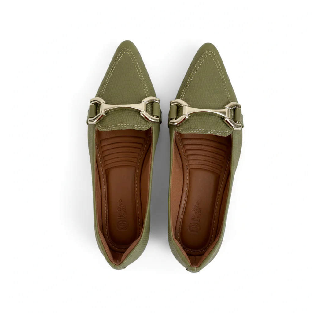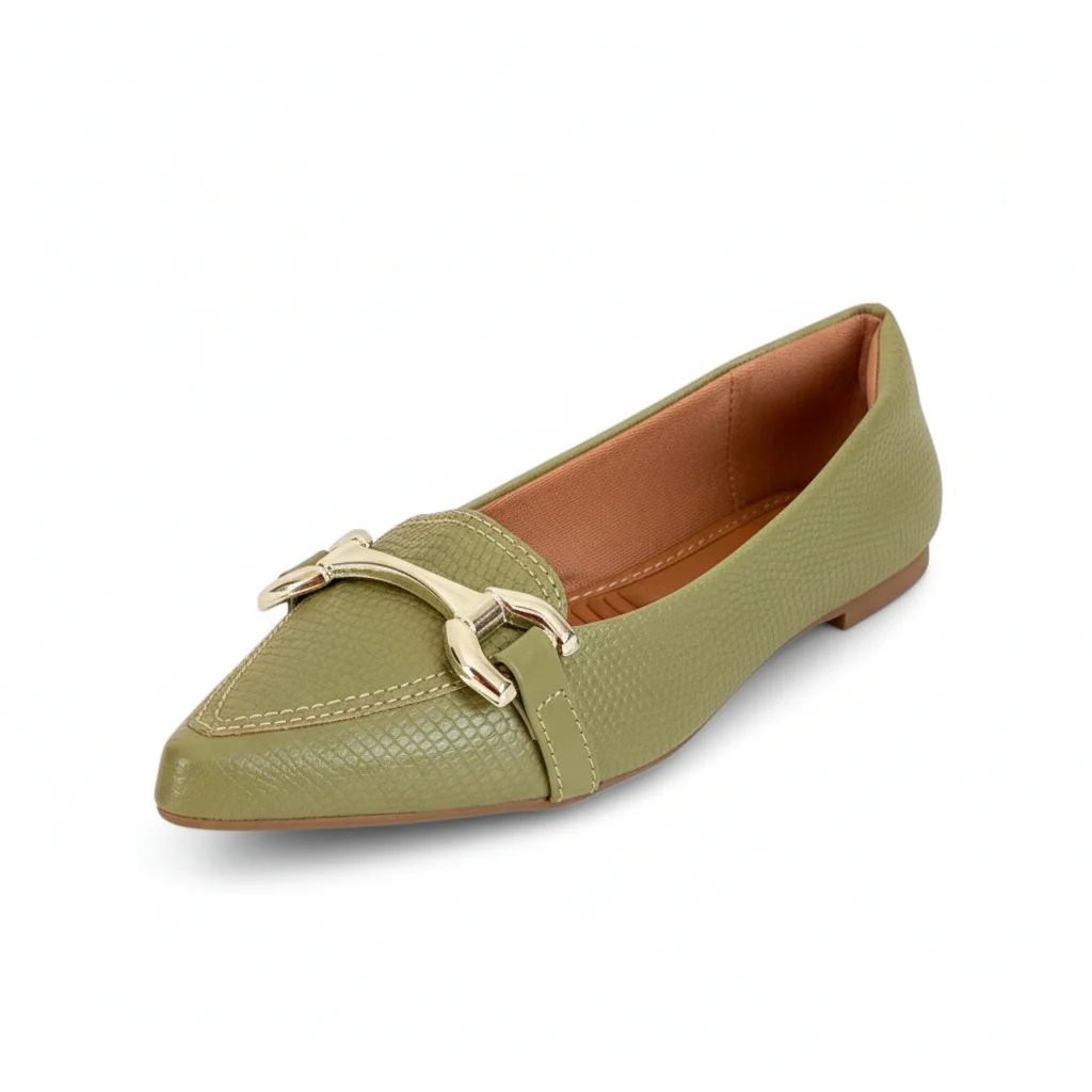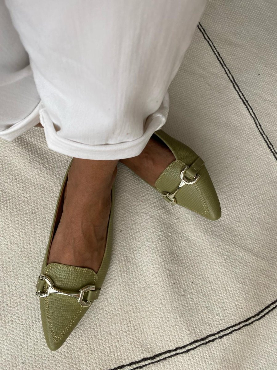 Las Bailarinas Oliva estilo slippers son mucho más que un zapato: son una declaración de estilo. Su elegante tono verde oliva con acabado efecto cocodrilo mate y detalle dorado las convierte en la pieza perfecta para destacar con clase.