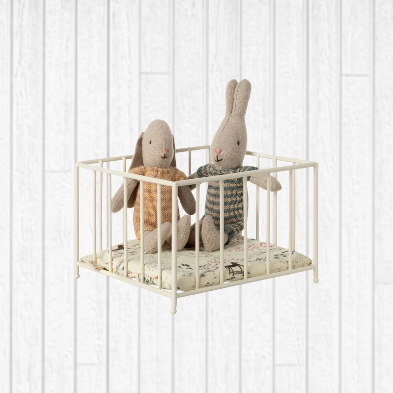 El parque se adapta a conejitos/conejos de tamaño micro y bebé Teddy. Mantendrá seguros a los pequeños miembros de la familia, y puedes usarlo para una pequeña área de juegos. Está hecho de metal y tiene un colchón suave en la parte inferior.