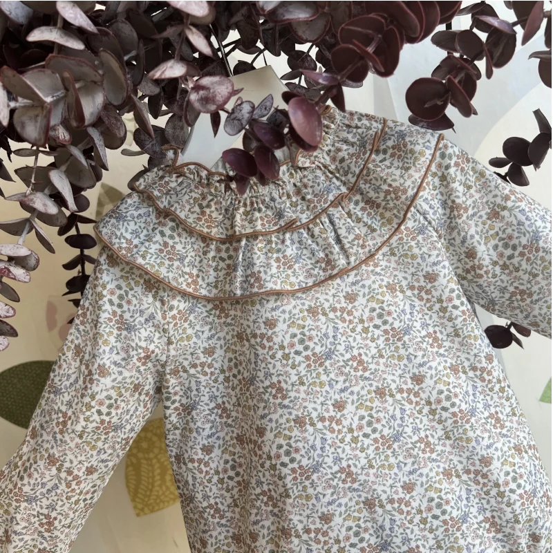 PELELE FLORES MONTPELLIER, confeccionado en un bonito tejido liberty en tonos caramelo y azul empolvado sobre fondo blanco roto, cuello a la caja con doble volante superpuesto con rulo en color caramelo en ambos , puño engomado. Abertura trasera e inferior mediante botones. Pertenece a la colección invierno 2025 de la firma española de moda infantil LA MARTINICA.