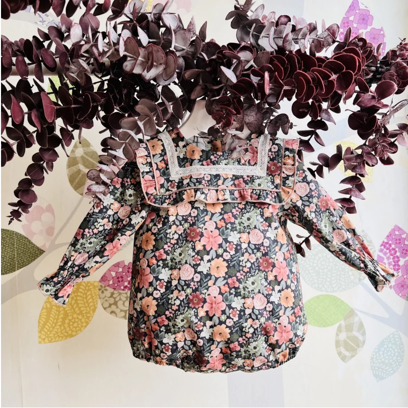 PELELE FLORES UN PEDACITO DE MI, confeccionado en estampado floral sobre fondo oscuro donde destacan los tonos rosáceos. Cuello marinero con un pequeño volantito a modo de finalización, y una preciosa tirilla de bolillo en tono crudo. Puño engomado para que la prenda no se suba hacia arriba. Abertura mediante botones tanto en la parte inferior como en la parte trasera.