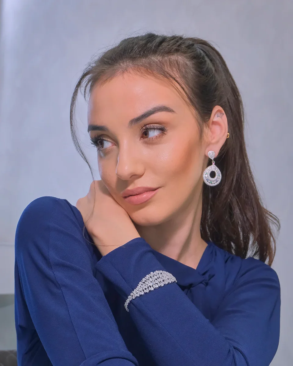 | Pendientes largos en plata con cuajado de circonitas blancas y de colores intercaladas en forma de gota, cierre presión, largo 4,5cm |