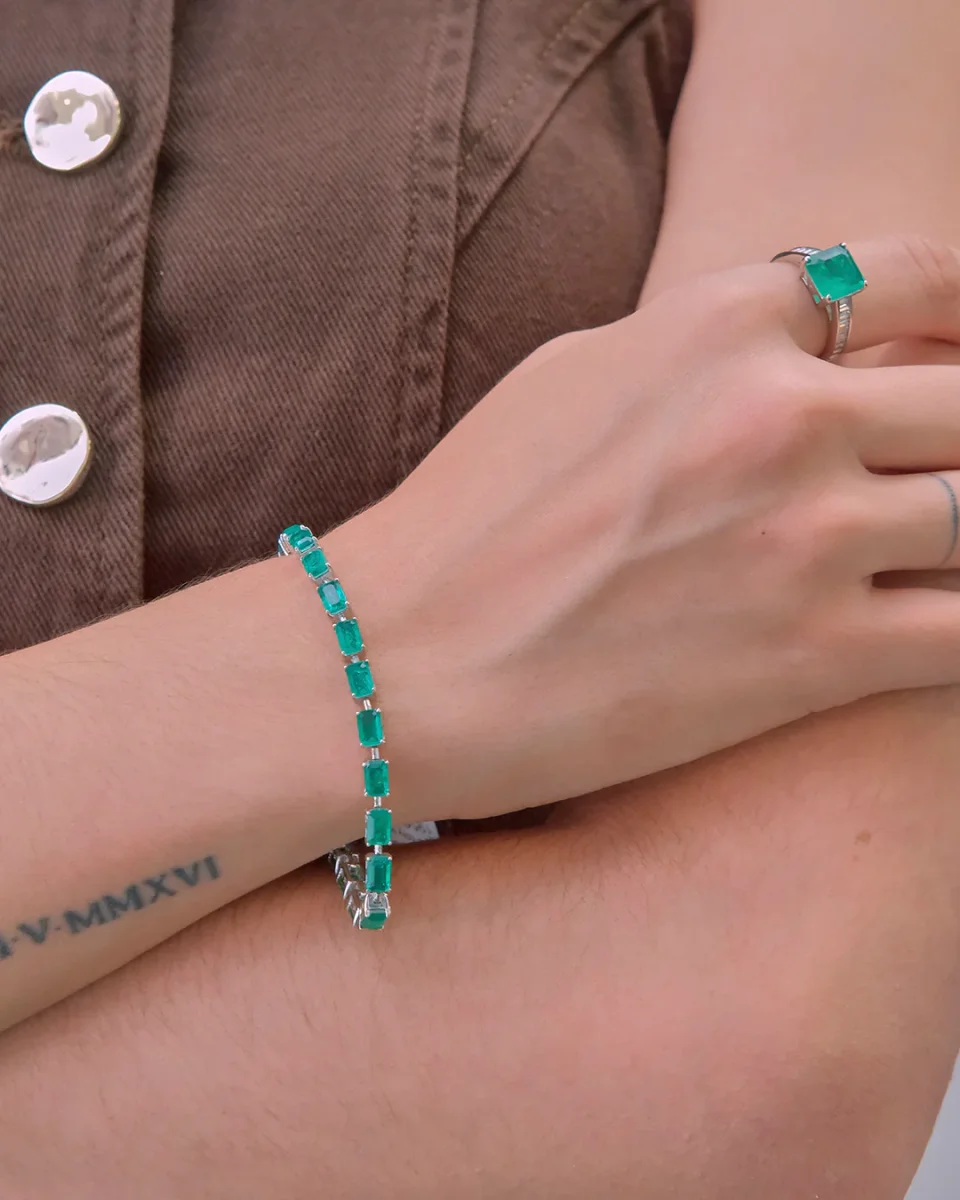 Pulsera en plata con circonitas talla esmeralda y color verde esmeralda engastadas en garra, cierre de seguridad