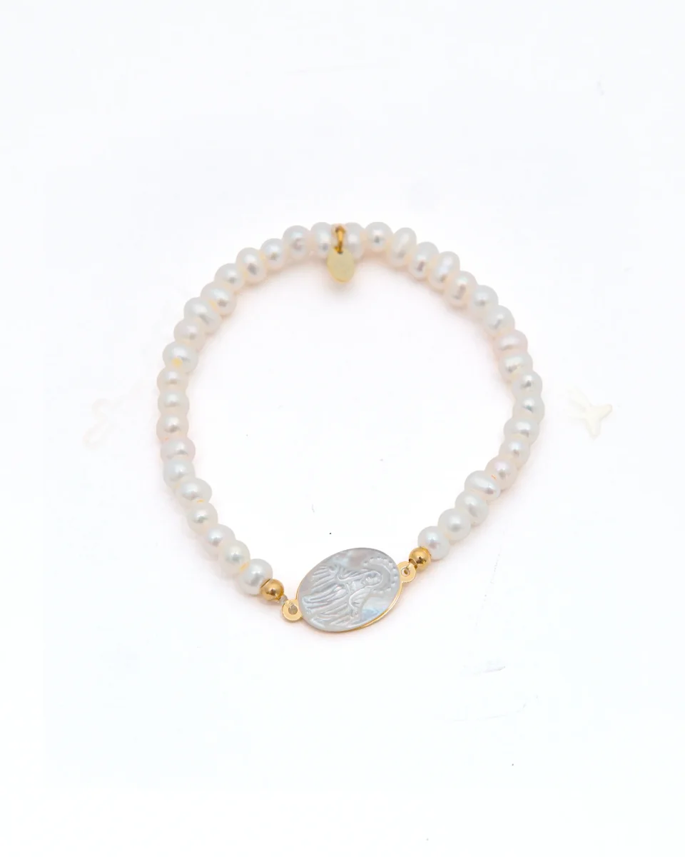 | Pulsera de perlas con Virgen de la Milagrosa en nácar y plata con baño de oro, tamaño virgen 15mm, con silicona extensible, sin cierre |