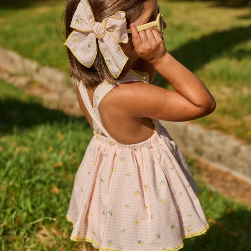 Este peto corto es la combinación perfecta de tradición artesanal y diseño contemporáneo. Confeccionada en un delicado tejido de cuadros Vichy rosa y blanco, destaca por su vibrante estampado de limones amarillos con detalles en verde hoja, que evocan los días de sol y juegos al aire libre.