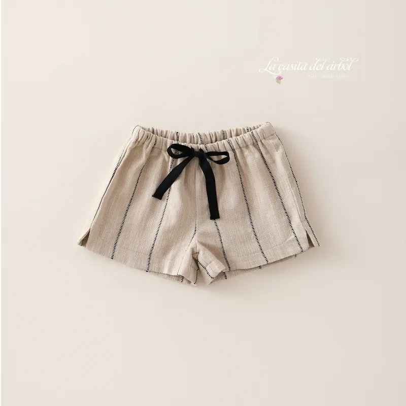 SHORT CÁÑAMO MI CANESU, confeccionado en tejido tipo rústico beige crudo con vainica sobre fondo negro en sentido vertical, cinturilla con goma elástica y cinta negra en el centro. Pertenece a la colección PINK COCO de la temporada VERANO 2026 de la firma española de moda infantil MI CANESU.