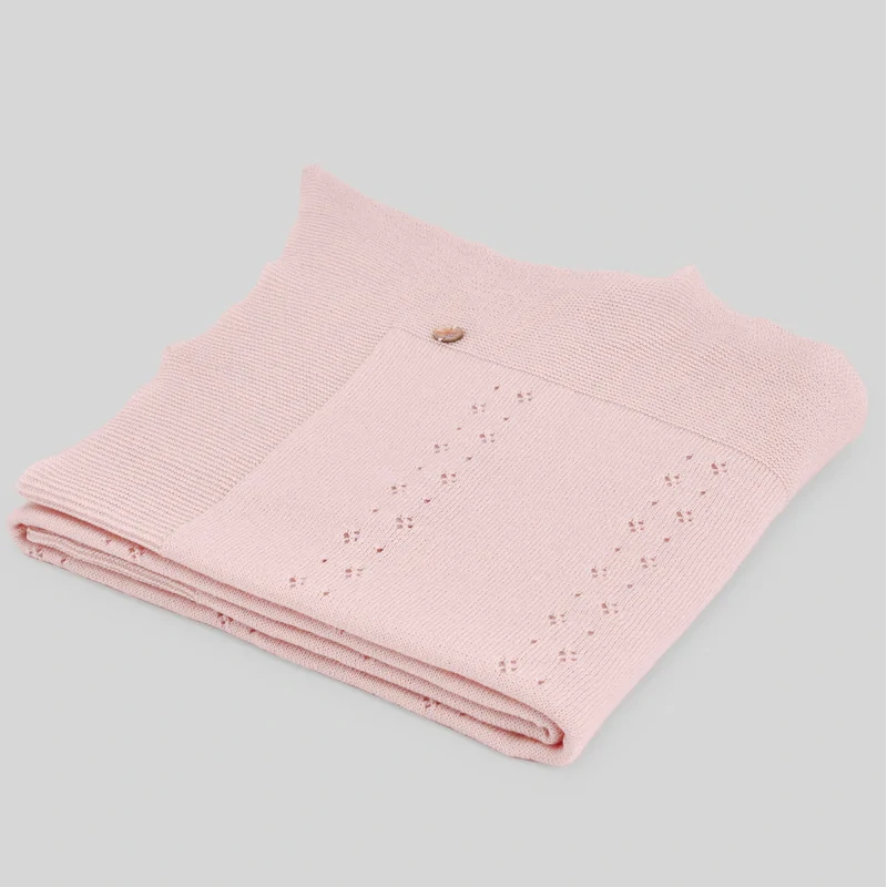 Confeccionada en España con hilo de alta calidad, esta manta ligera destaca por su delicado detalle calado en los laterales y un acabado de punto bobo que aporta textura y distinción. Es el complemento perfecto para la salida del hospital, bautizos o paseos elegantes.
