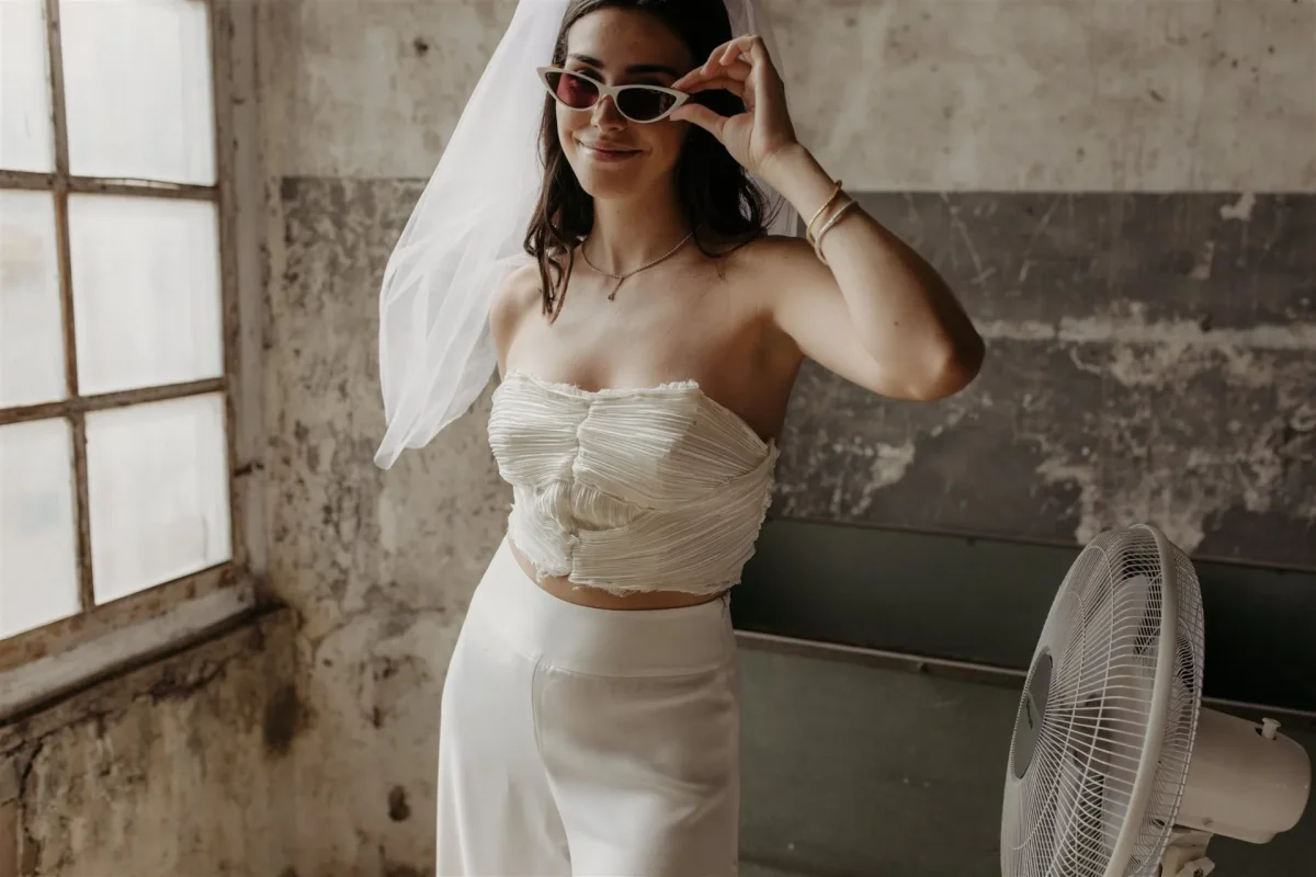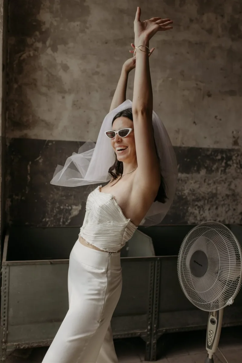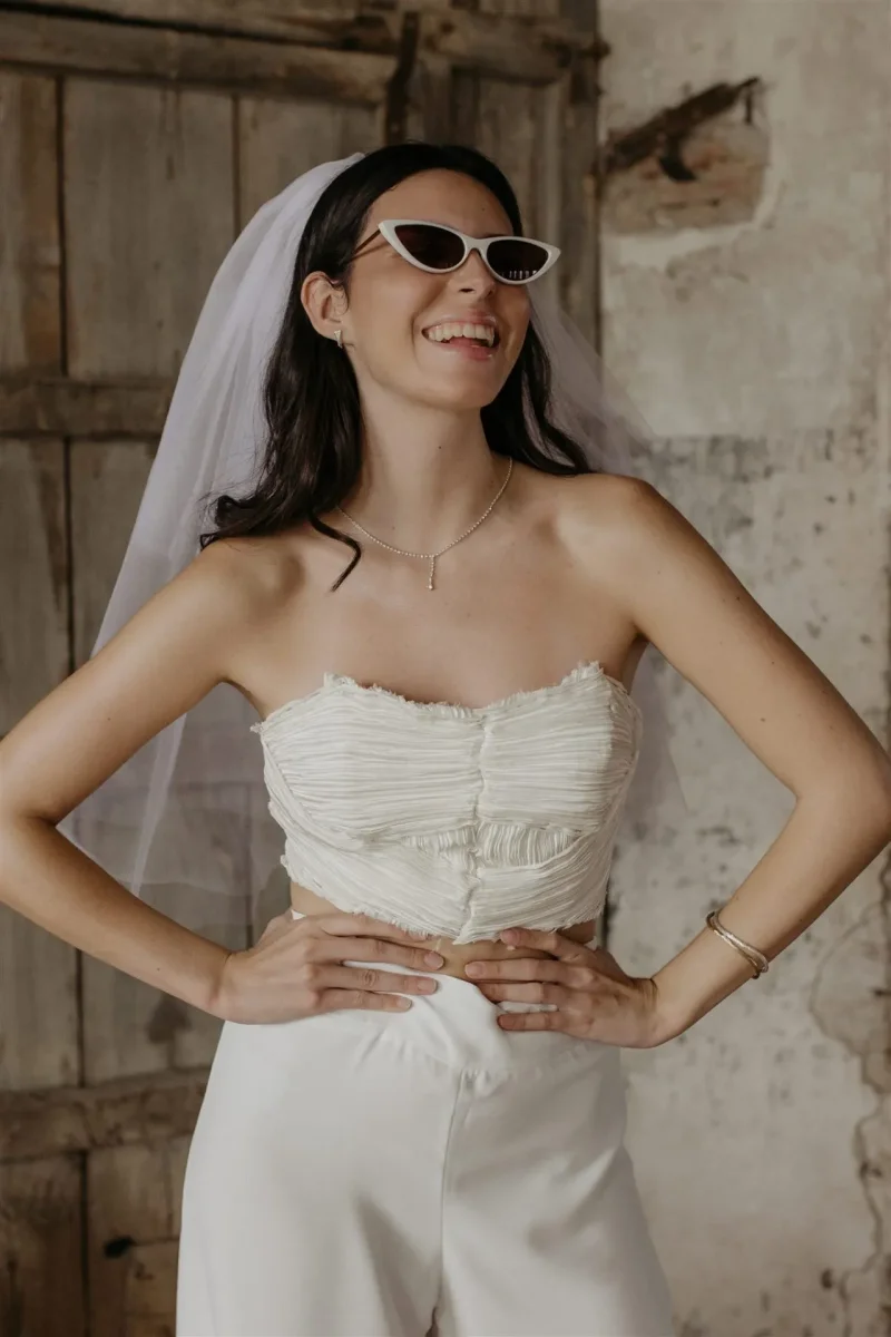 El vestido ideal para novias e invitadas Millennial. Es una combinación entre su mundo y el nuestro. La parte de atrás del vestido tiene triangulaciones en el corte, en los remates de la espalda y también en la zona delantera, inspiradas en los cortes Art Decó.